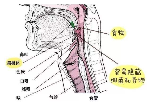 喉咙是一般用语,指的是咽喉腔,其实,张开嘴巴看到的前部分是口腔,后部分是咽喉,往下一点接近声带的部位则是喉部。扁桃体内含抗感染的细胞,是咽喉腔的一种淋巴组织,在咽部和口腔交界处的两侧面。